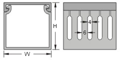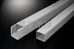 材質: 採用UL合格之南亞PVC(灰色)製成,通過美規94V-0防火等級,歐規M1防火等級,耐燃性佳,絕緣性良好,不自燃,耐溫至85℃。膠層為PE共聚合物 (PE copolymer)。 構造: 由槽底及槽蓋兩部份組成,槽底兩側設出線孔,以組合後外部之寬、高為規格標準,UL測試溫度50℃。 特點: 1. 配線槽底座兩側出線孔互相對齊,任何處鋸斷或接成 L 型均可保持盤面美觀、整齊。 2. 槽蓋經特殊設計,與配線槽底座組合後絕不脫落,且接合面平滑,不割傷手及擦損附近配線。 3. 出線孔低、組合容易、拆卸簡單,易於配線。 4. 於配線槽上蓋掛勾之內面設有「特殊止滑膠層」,能有效增加澀度及黏度,使線槽與上蓋密合,防止上蓋滑動、脫落,更利垂直上下佈線作業,提昇施工效率。